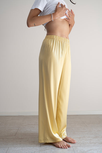 Questo pantalone in raso di seta italiana nasce come capo da casa o pigiama, ma ha l'eleganza e la leggerezza giusta per accompagnarti anche fuori, magari in una sera d'estate, con un sandalo sottile o una ciabattina