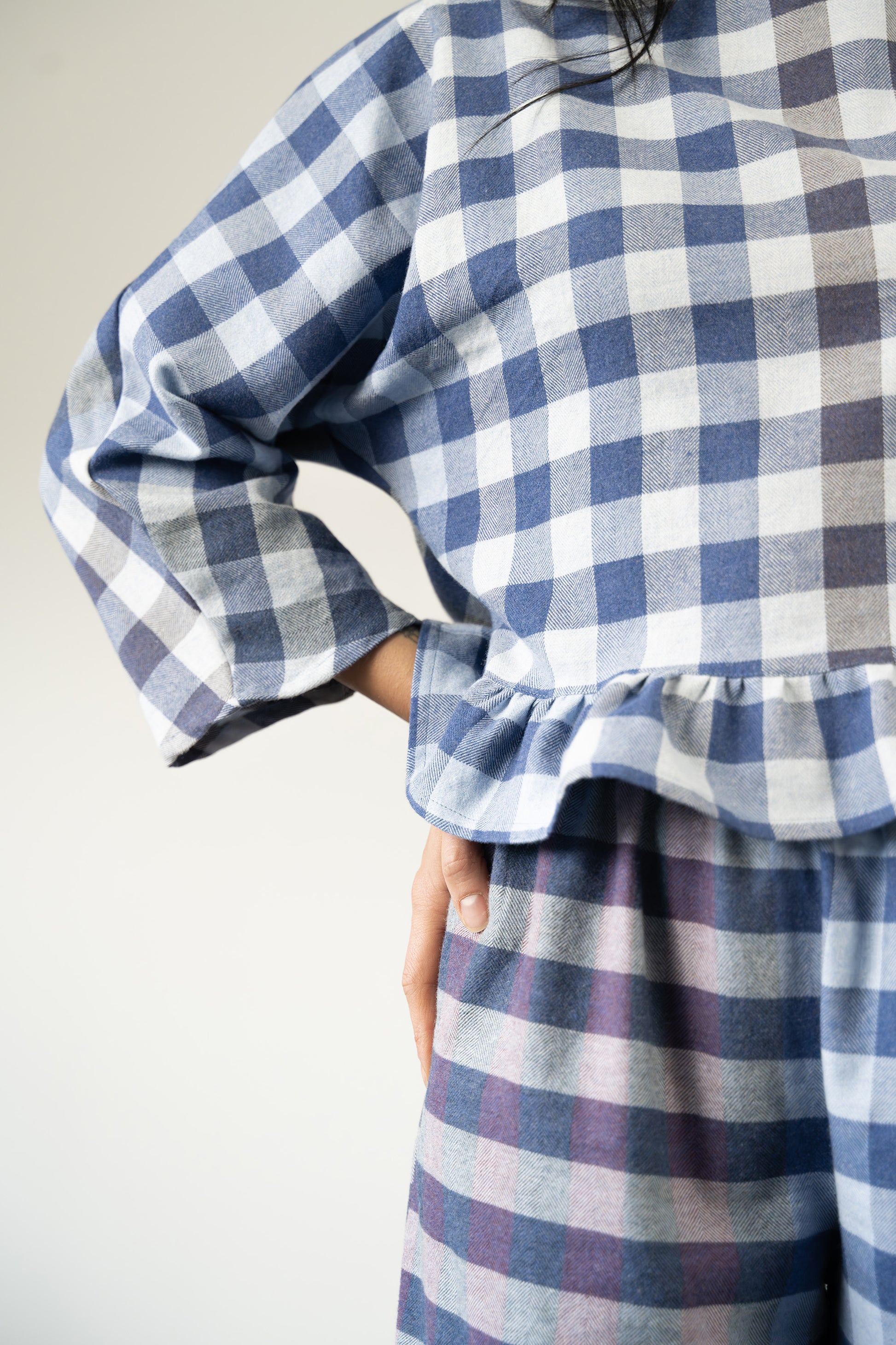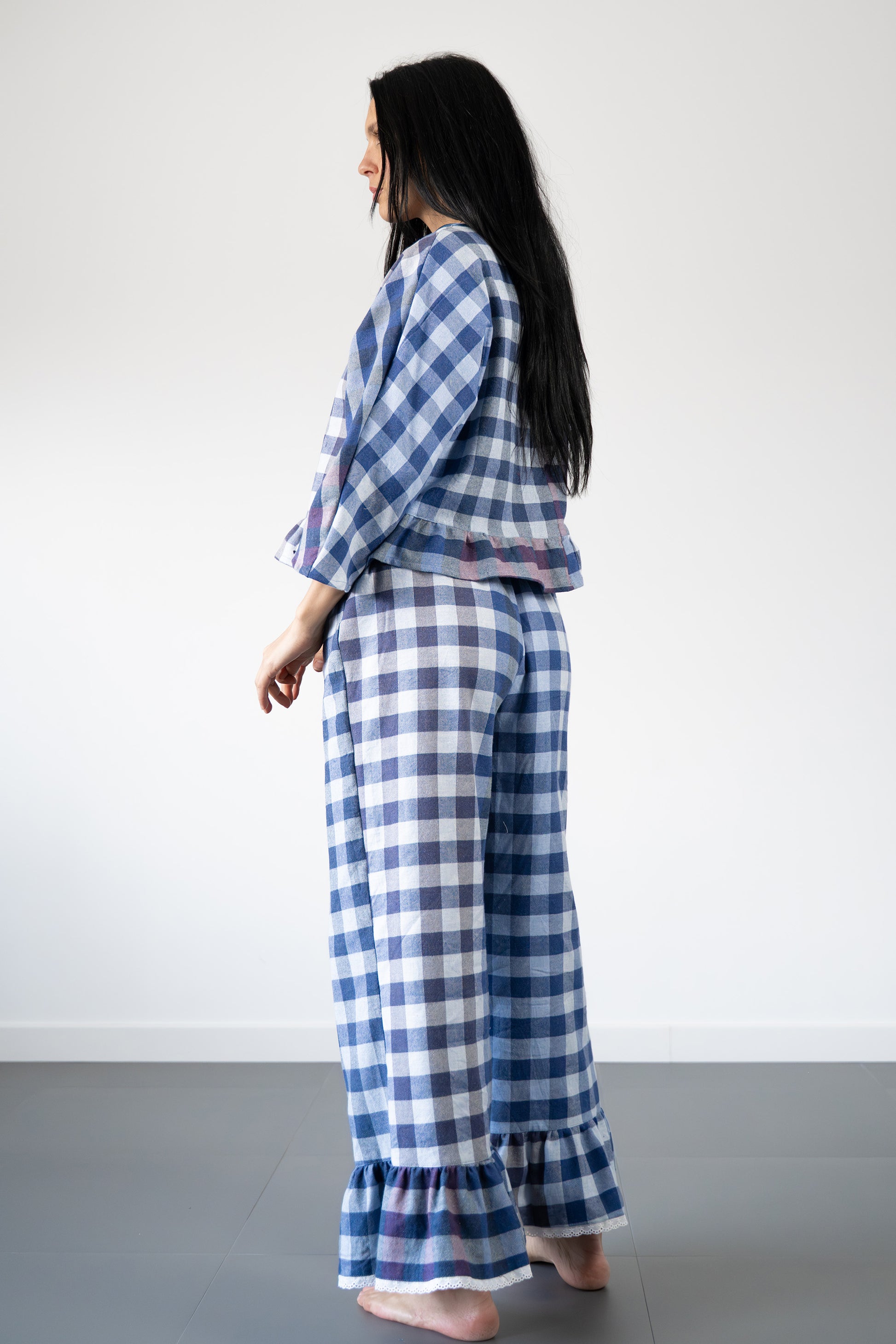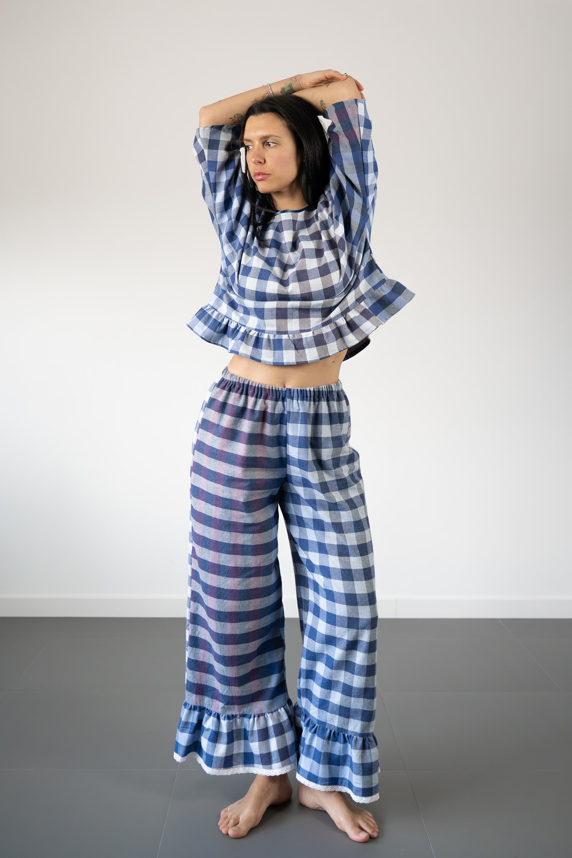 Un completo artigianale in morbida flanella di cotone, caldo e avvolgente, pensato per offrirti comfort assoluto senza rinunciare allo stile. Nato come pigiama, ma perfetto anche da indossare fuori casa: con uno stivale, una sneaker o un cappotto strutturato diventa un look rilassato ma sofisticato.
