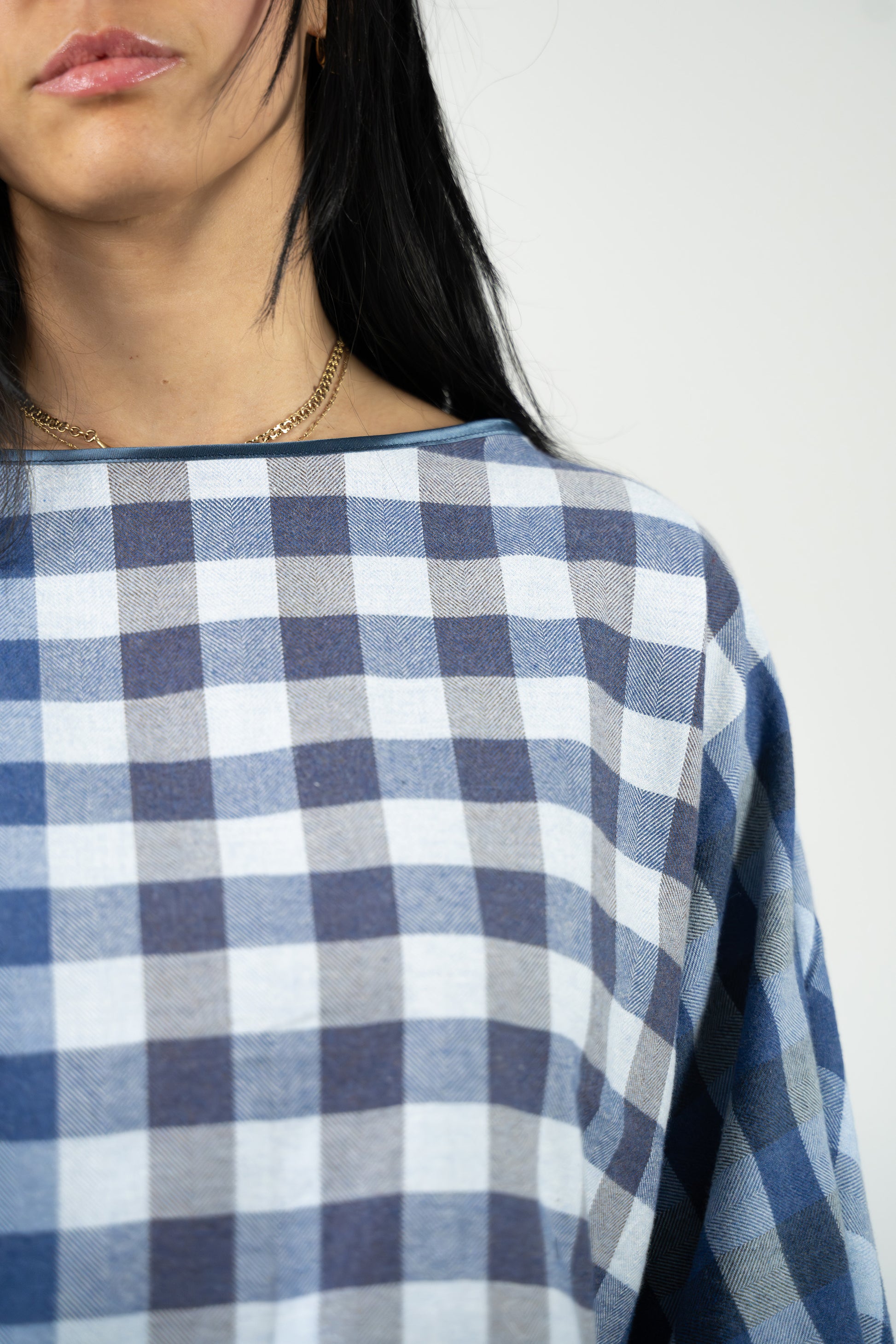La blusa chiusa presenta un elegante scollo a barchetta che valorizza delicatamente la linea delle spalle, donando femminilità e leggerezza. Le maniche 3/4 slanciano la figura e rendono il capo pratico e raffinato.