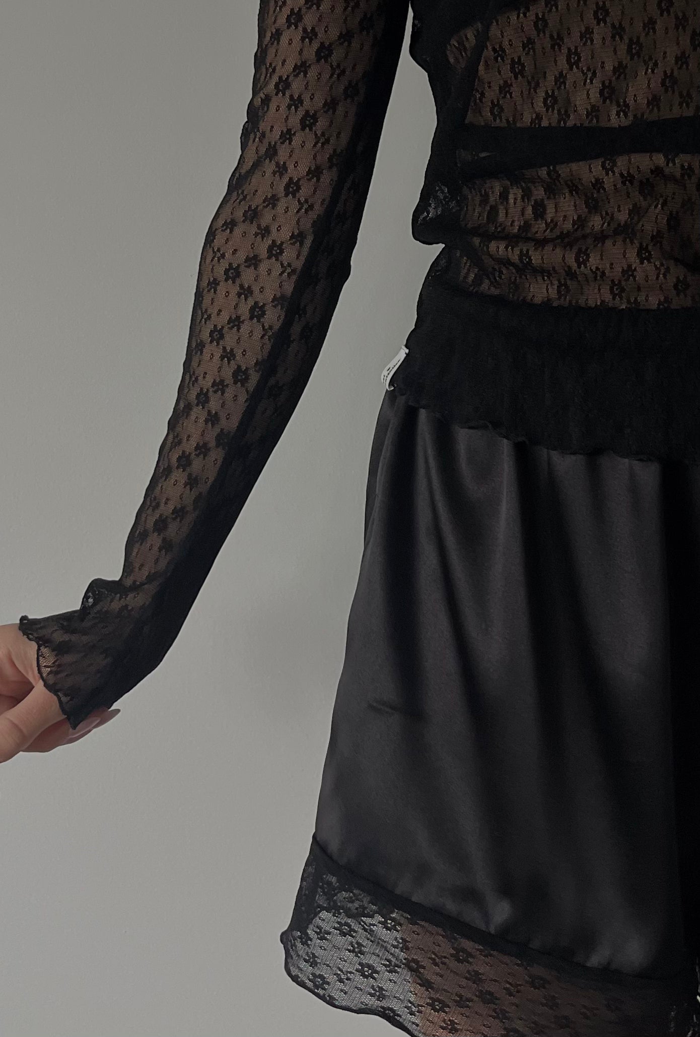 Il pizzo leggero avvolge il corpo con naturalezza, mentre lo scollo a barchetta e le maniche lunghe donano una linea sofisticata e senza tempo. Gli orli irregolari aggiungono un tocco ricercato e contemporaneo, rendendo il capo unico e distintivo.