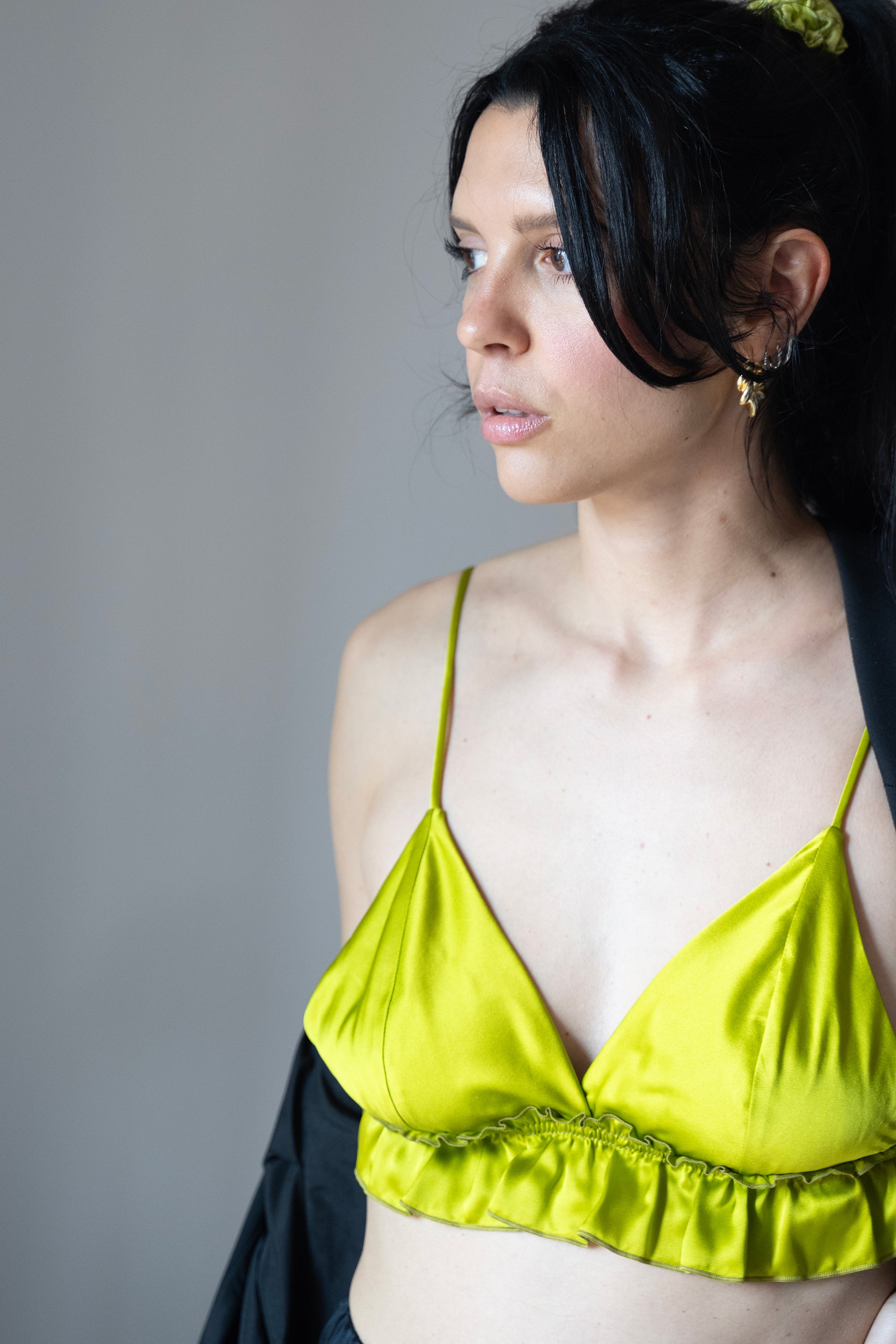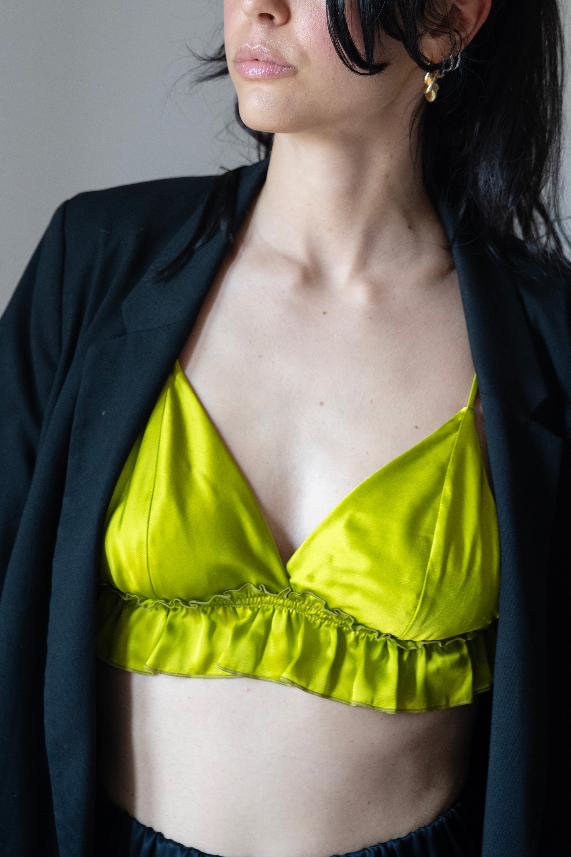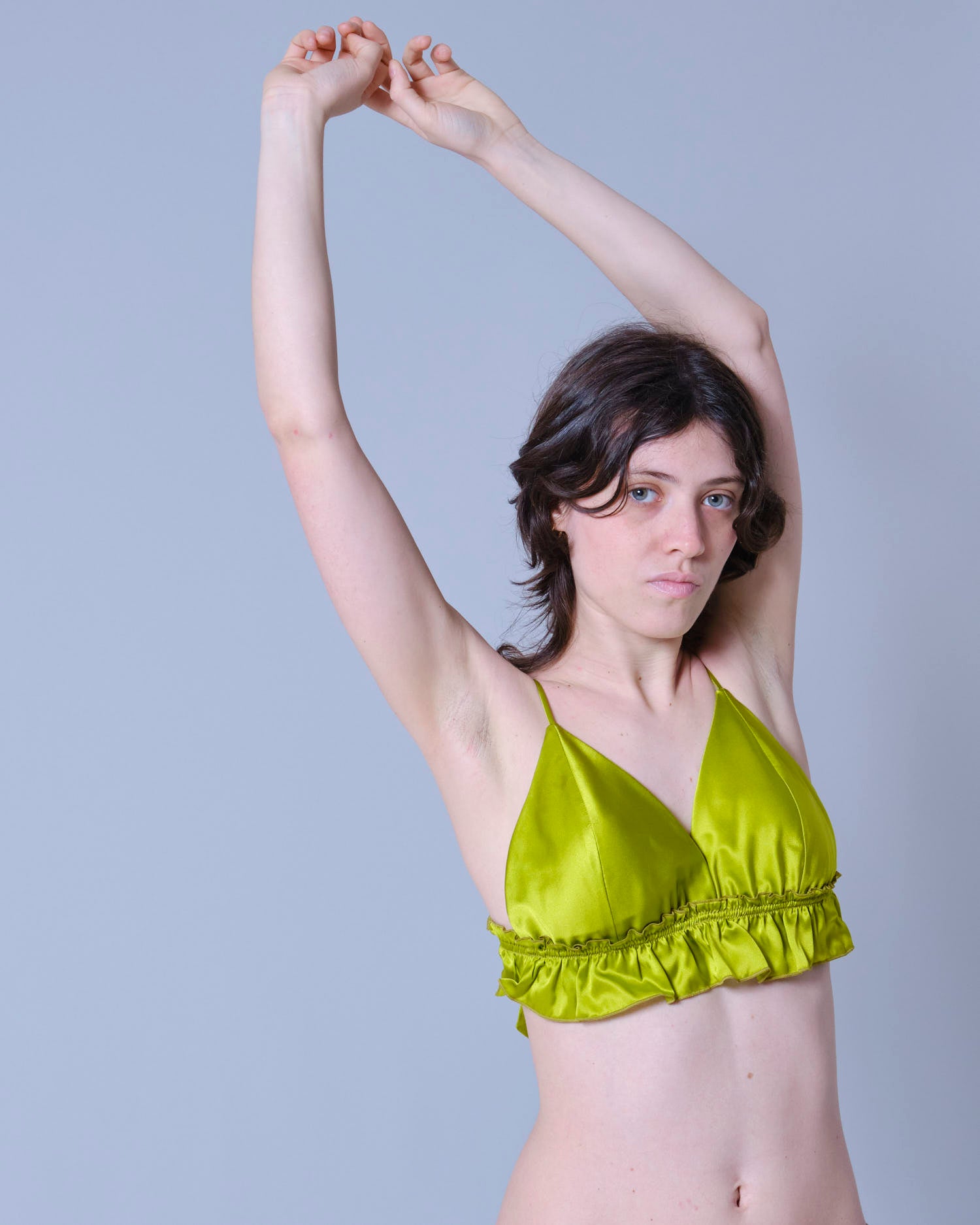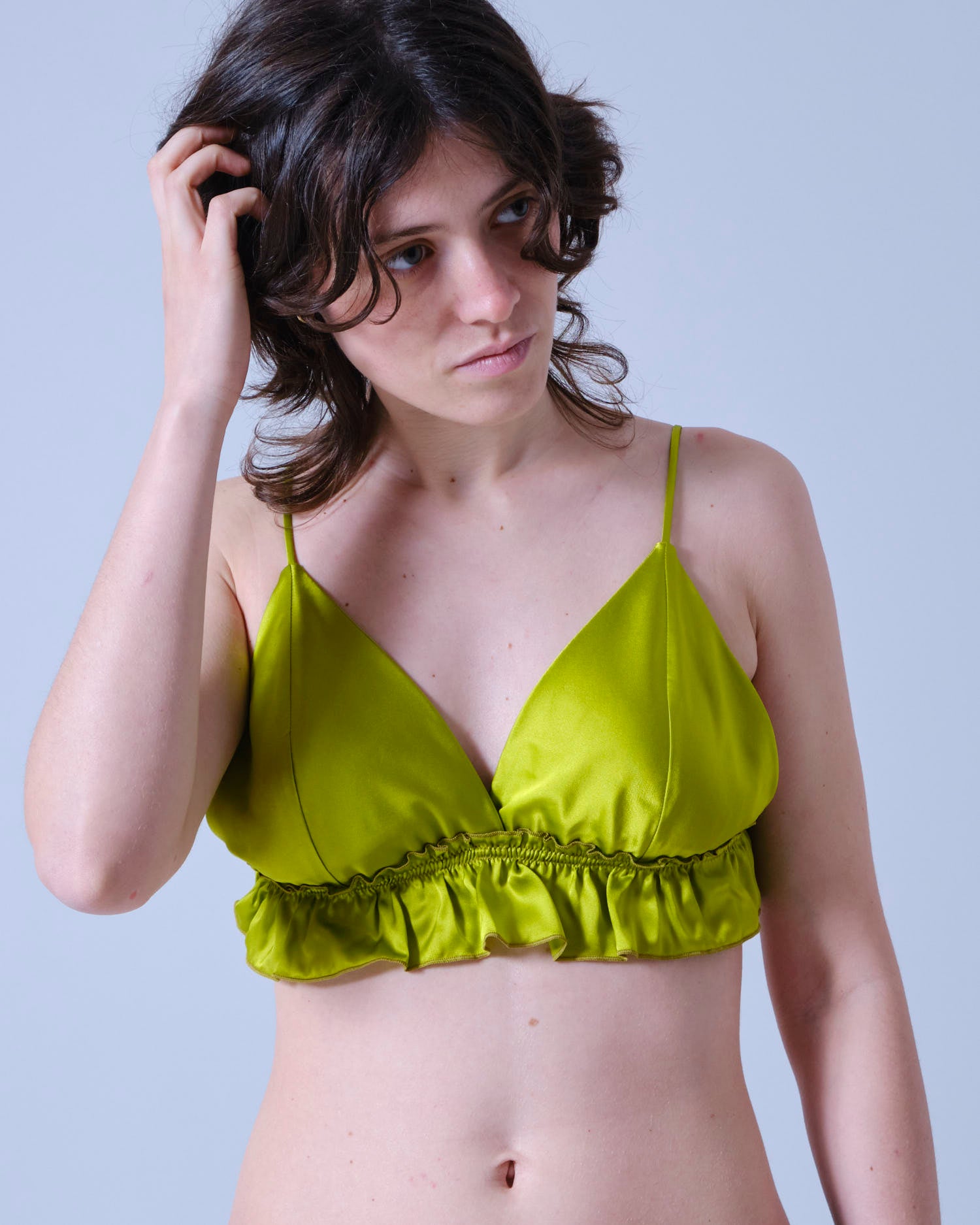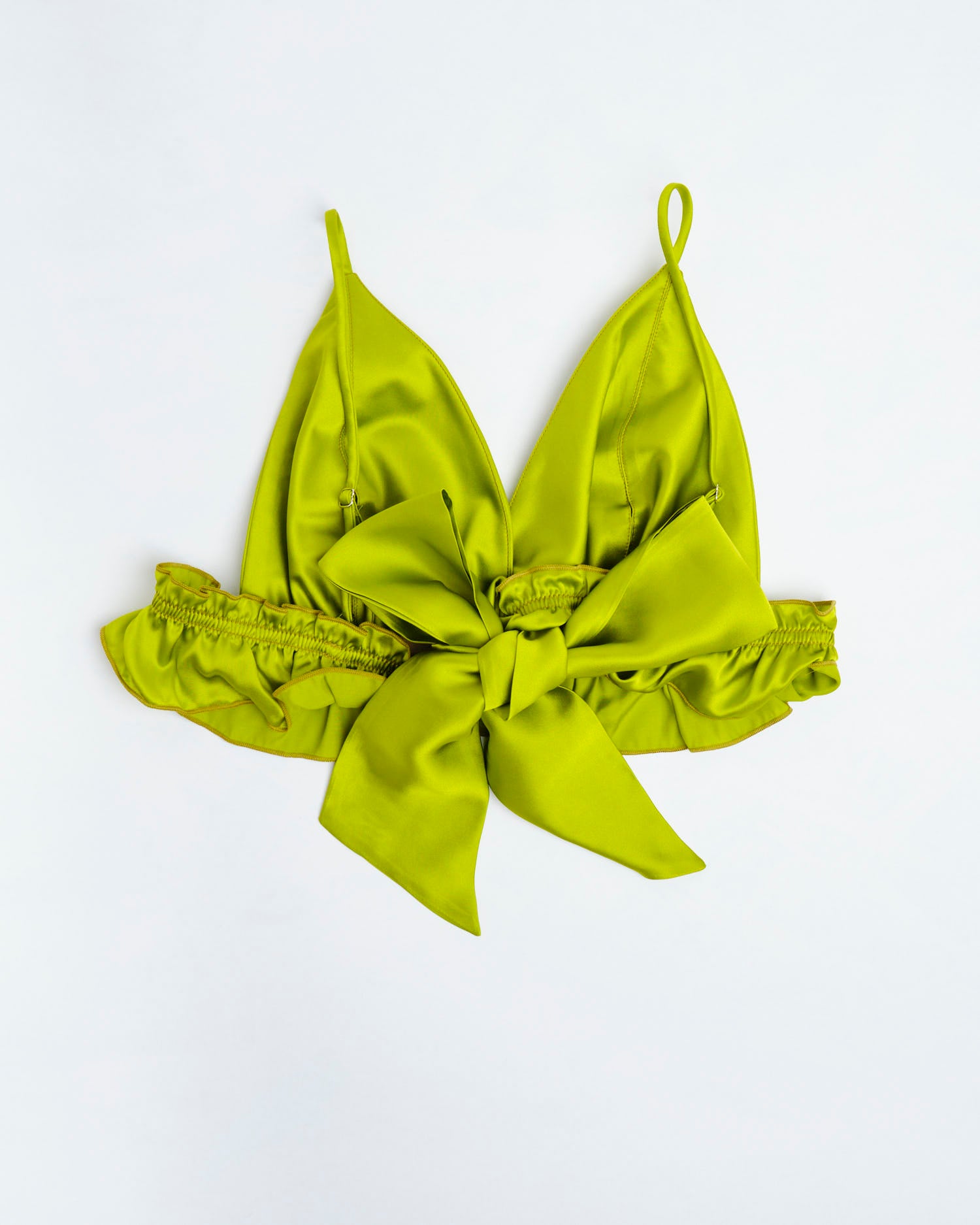 Non costringe il corpo, ma anzi è comodo sulla pelle, le coppe a triangolo offrono un sostegno delicato e una silhouette raffinata, mentre una balzina romantica sotto al seno aggiunge un tocco di femminilità sofisticata.